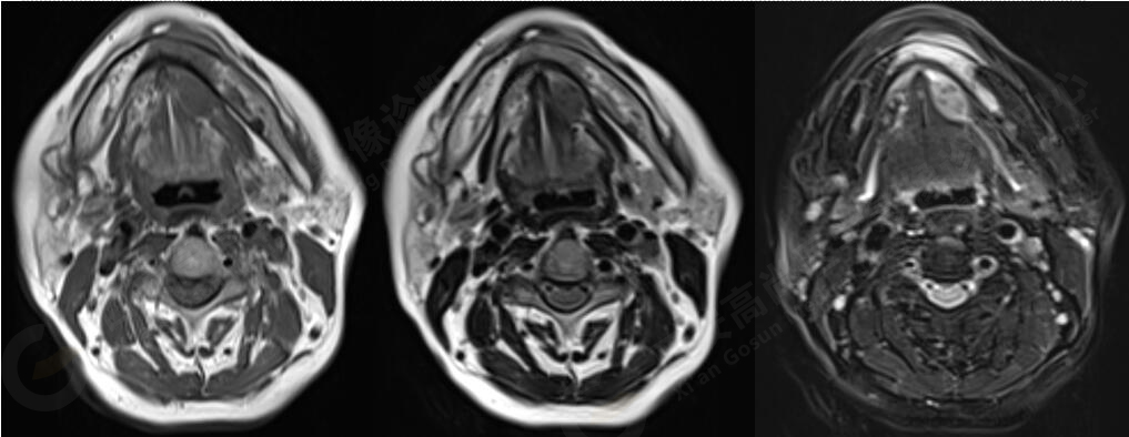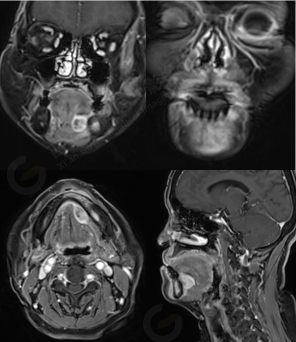 此腫瘤位于左側口底部下頜骨周圍,未見明顯囊變,下頜骨骨質破壞,DWI像上病灶呈明顯低信號,ADC圖上呈低信號,增強后不均勻明顯強化,病人年齡較大,可以考慮惡性腫瘤,口底好發(fā)鱗癌。