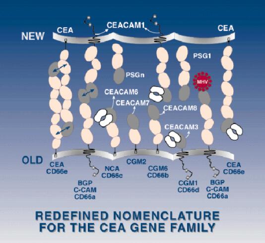 癌胚抗原(CEA)本質(zhì)上是一種糖蛋白。正常情況下,它會(huì)出現(xiàn)在兩個(gè)地方,一個(gè)是嬰幼兒的胃腸道組織,一個(gè)是成年人的粘膜細(xì)胞。假如某些細(xì)胞發(fā)生癌變,它們會(huì)大量表達(dá)癌胚抗原,接著,利用癌胚抗原將自己與正常細(xì)胞連接在一起。有學(xué)者認(rèn)為,這種機(jī)制有助于癌細(xì)胞轉(zhuǎn)移。