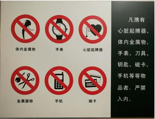 磁共振設(shè)備是利用磁場(chǎng)成像,可以說(shuō)MR就是一塊巨大的磁體,具有強(qiáng)大吸引力。磁性金屬物品帶入磁共振檢查室,如果被吸引將變成一顆飛行的“子彈”,危險(xiǎn)性極大。所以嚴(yán)禁將鐵磁性的物品帶入檢查室,包括:手機(jī)、U盤、手表;電子產(chǎn)品;鑰匙、打火機(jī)、金屬硬幣、刀具、鋼筆、針、釘、鏍絲等鐵磁性制品;發(fā)夾、發(fā)卡、眼鏡、金屬飾品、不明材質(zhì)的物品;病床、輪椅等。