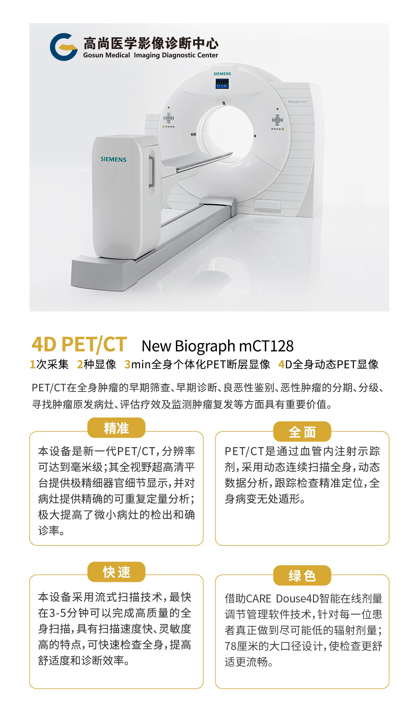 廈門高尚醫(yī)學(xué)影像診斷中心引進(jìn)西門子4D PET/CT Biograph mCT是目前全球領(lǐng)先的PET/CT之一。采用全球核醫(yī)學(xué)界公認(rèn)最具發(fā)展?jié)摿Φ母吣苜ゑR射線探測晶體LSO作為PET探測器材料。其采用先進(jìn)的晶體切割工藝及優(yōu)秀的符合事件探測電子線路設(shè)計,具有靈敏度高、準(zhǔn)確度高、檢查速度快、輻射劑量低的特點(diǎn),并且該設(shè)備具有業(yè)界公認(rèn)的最精確的PET定量分析系統(tǒng),可快速、準(zhǔn)確地評價腫瘤的治療療效。