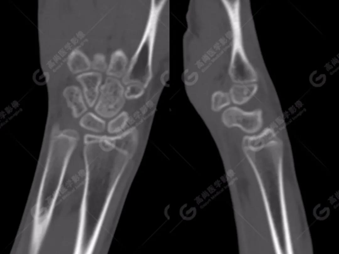 14歲男性,雙側腕部摔傷1天,雙側腕關節(jié)周圍壓痛,右手握拳乏力,按壓疼痛明顯,關節(jié)活動無明顯受限,體格檢查無明顯骨摩擦感;經過一天后疼痛無明顯改善,遂來高尚醫(yī)學影像診斷中心行相關檢查。