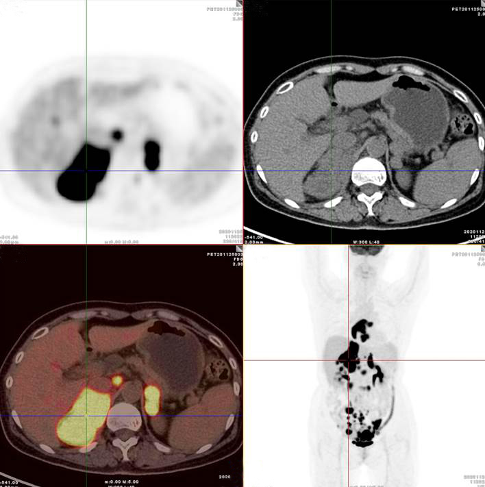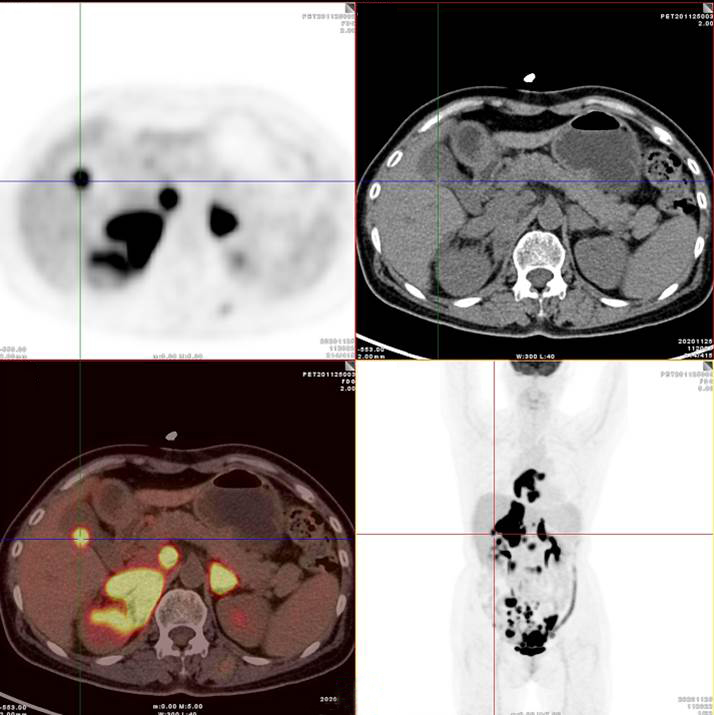 膽囊及雙腎上腺病灶、腹膜后淋巴結(jié)放射性攝取明顯增高