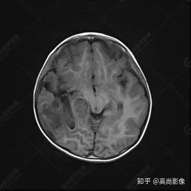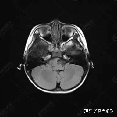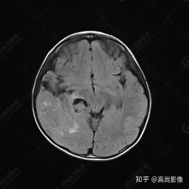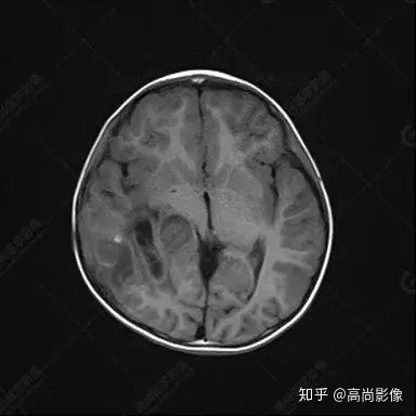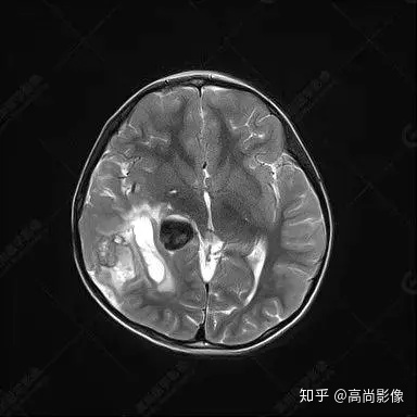 非典型畸胎樣/橫紋肌樣瘤(AT/RT) 是一種高度惡性中樞神經(jīng)系統(tǒng)腫瘤,臨床罕見,臨床表現(xiàn)無(wú)特異性,好發(fā)于 5 歲以下兒童,尤以 3 歲以下多見,在兒童原發(fā)性中樞神經(jīng)系統(tǒng)(CNS)腫瘤中占 1%~3%。該腫瘤體積一般較大,幕上大于幕下,有明顯的占位效應(yīng)。該腫瘤成分復(fù)雜,囊變、出血、壞死常見。因此 AT/RT信號(hào)混雜,囊性部分呈 T1WI低、T2WI高信號(hào),增強(qiáng)后不強(qiáng)化;若瘤體出血,囊內(nèi)可見T1WI稍高信號(hào)、T2WI低信號(hào),實(shí)性部分在 T1WI上呈混雜等、低信號(hào),在T2WI 及 T2-FLAIR上呈混雜等高信號(hào),增強(qiáng)掃描后大部分呈環(huán)形條帶樣明顯強(qiáng)化,中心壞死區(qū)不強(qiáng)化。另外,該腫瘤實(shí)性成分在DWI上呈高信號(hào),說(shuō)明腫瘤細(xì)胞核密集,水分子擴(kuò)散明顯受限,提示該腫瘤惡性程度高,容易復(fù)發(fā)及轉(zhuǎn)移。