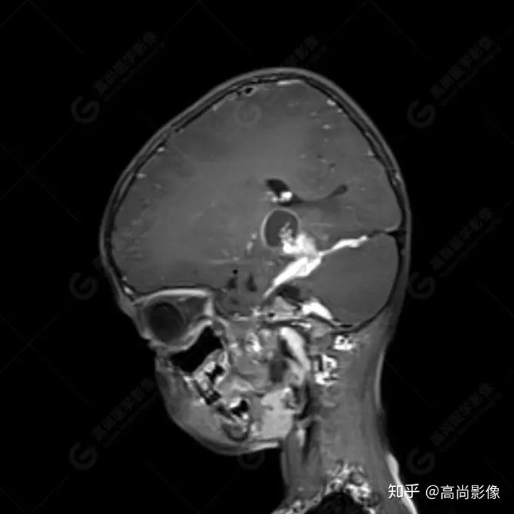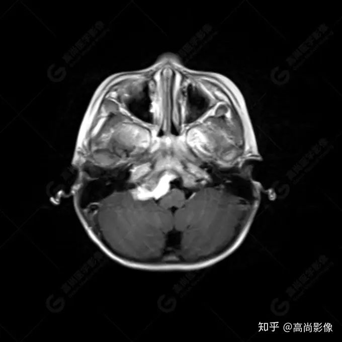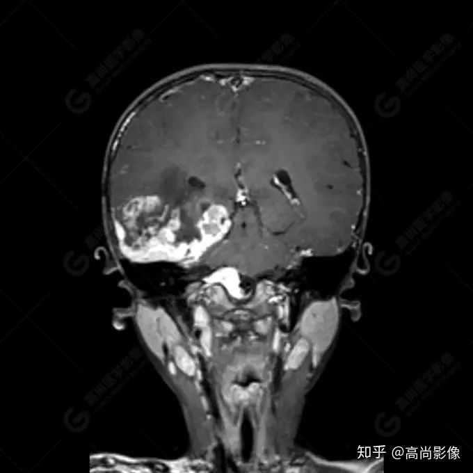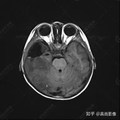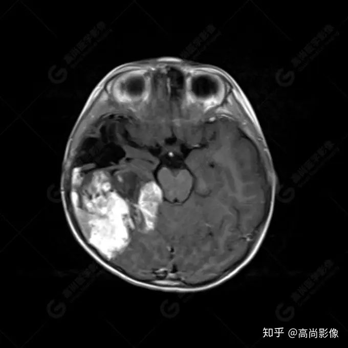 右側(cè)顳葉腫瘤切除術(shù)后:現(xiàn)術(shù)區(qū)后方右側(cè)顳枕葉及延髓右前方占位,右側(cè)顳枕部硬腦膜及小腦幕明顯強(qiáng)化,結(jié)合既往影像資料,考慮為胚胎源性惡性腫瘤,如非典型畸胎樣/橫紋肌樣瘤(AT/RT)或原始神經(jīng)外胚層腫瘤(PNET)。