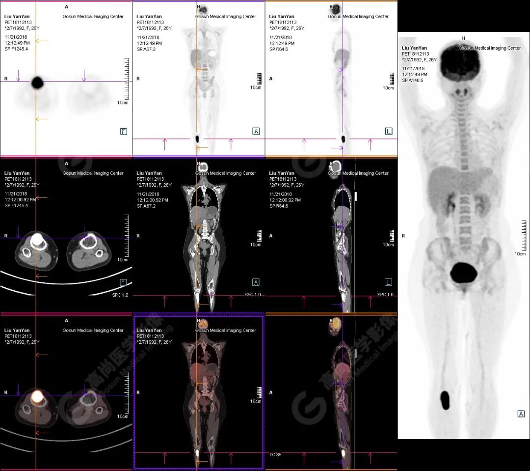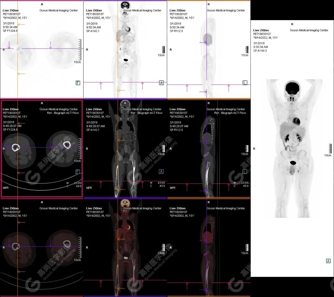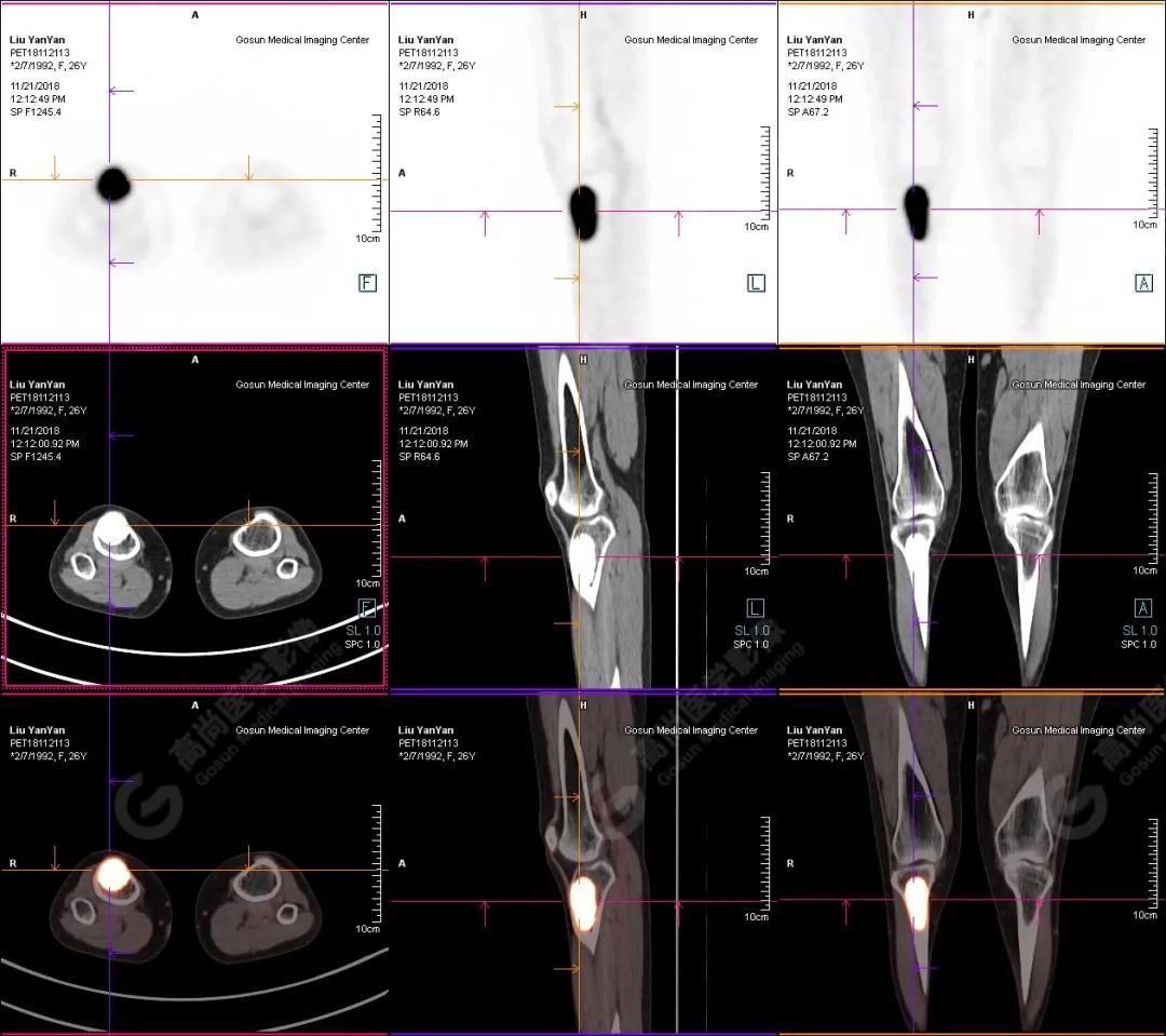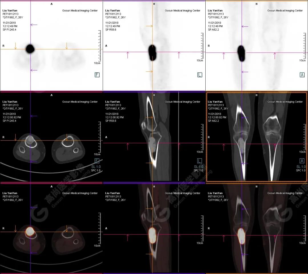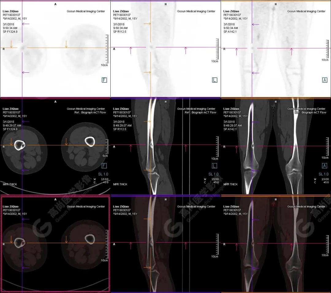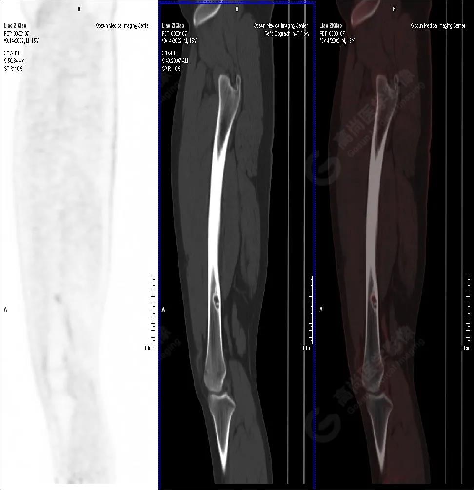 右側脛骨上段髓腔內(nèi)見卵圓形塊狀高密度影,長徑與脛骨長軸平行,邊界清楚,密度欠均勻,CT值介于287.0Hu~425.0Hu,放射性攝取增高,SUV最大值為15.8,平均值為13.1。
