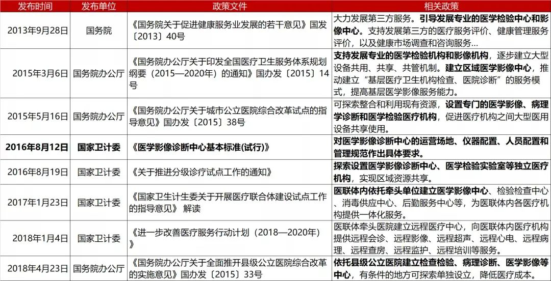 近年來,我國鼓勵第三方影像中心的政策春風(fēng)徐徐吹來。2013年,國務(wù)院發(fā)布《國務(wù)院關(guān)于促進健康服務(wù)業(yè)發(fā)展的若干意見》,明確指出“大力發(fā)展第三方服務(wù),引導(dǎo)發(fā)展專業(yè)的醫(yī)學(xué)檢驗中心和影像中心”,獨立影像中心政策的限制得到放開,相關(guān)第三方影像中心在此后發(fā)起成立。2016年8月,國家衛(wèi)計委出臺《醫(yī)學(xué)影像診斷中心基本標(biāo)準(zhǔn)(試行)》,自此我國醫(yī)學(xué)影像診斷中心行業(yè)發(fā)展得到規(guī)范和指導(dǎo),行業(yè)發(fā)展有章可循。隨后在2016-2018年,后續(xù)政策文件陸續(xù)出臺。