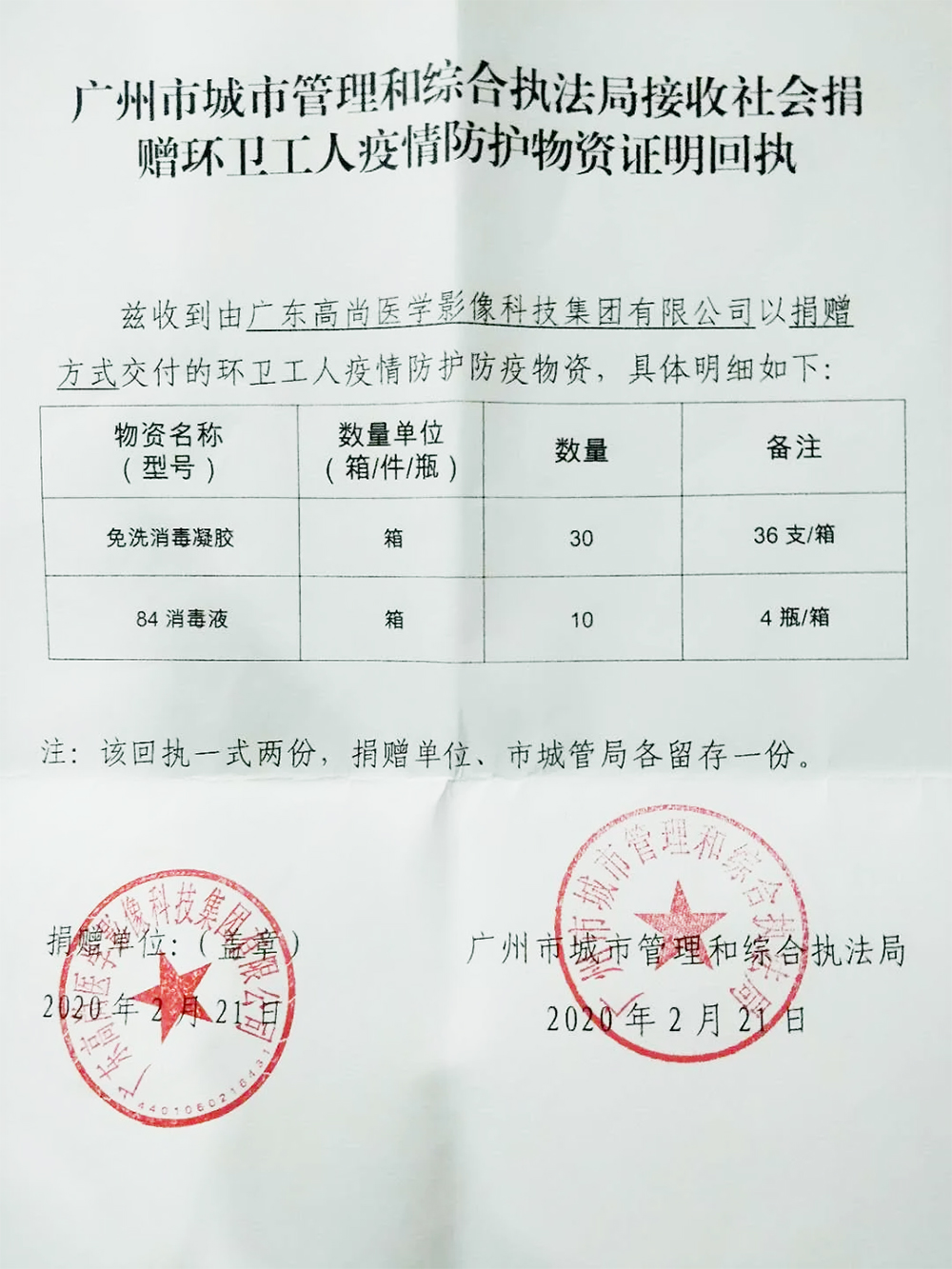 庚子鼠年的春節(jié),他們放棄了春節(jié)與家人團聚的機會,投入到環(huán)境整治一線,為切斷病毒來源、抗擊疫情堅守在自己的崗位。高尚醫(yī)學影像關愛保障民生的守崗戰(zhàn)士,向廣州市城市管理和綜合執(zhí)法局捐贈免洗消毒凝膠1080瓶、84消毒液10箱等一批消毒物資,用于環(huán)衛(wèi)工人在工作中消毒防護。